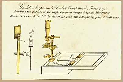 Este microscopio tipo Cary-Gould de Abraham & Co. es de bolsillo. Reproduce fielmente el modelo original de Cary-Gould (nº 25 de esta colección). Tiene un elegante estuche de caoba de 16x11x6 cm. En la parte superior de la tapa presenta un orificio metálico para la fijación a rosca del eje del microscopio. Este es rectangular con el borde posterior dentado, cremallera sobre la que actúa el piñón que permite el ascenso de la platina para conseguir el enfoque (enfoque inverso).