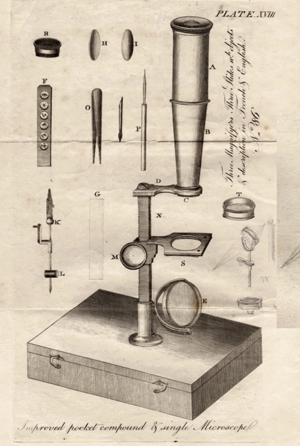 La platina es anular con dos pequeños orificios para insertar las pinzas y la lente externa que permite la iluminación incidente (ojo de buey). Debajo existe otra platina igual y que permite situar entre ellas las preparaciones con las muestras a observar. En la parte superior del eje se articula una pieza sobre la que entran a rosca las lentes de aumento, actuando entonces como microscopio simple. Sobre ellas o directamente sobre la rosca se fija el tubo óptico, que mide 13 cm. siendo entonces el aparato un microscopio compuesto. Otro ejemplar igual a este es el nº40 de la Golub Collection.
