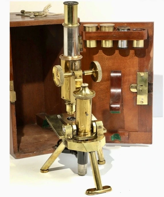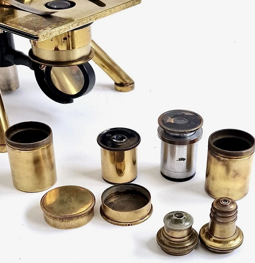 El microscopio está completo, con 3 objetivos y 2 oculares. La caja de caoba mide aproximadamente 33 x 16 x 21 cm. Peso: 4,7 kg .