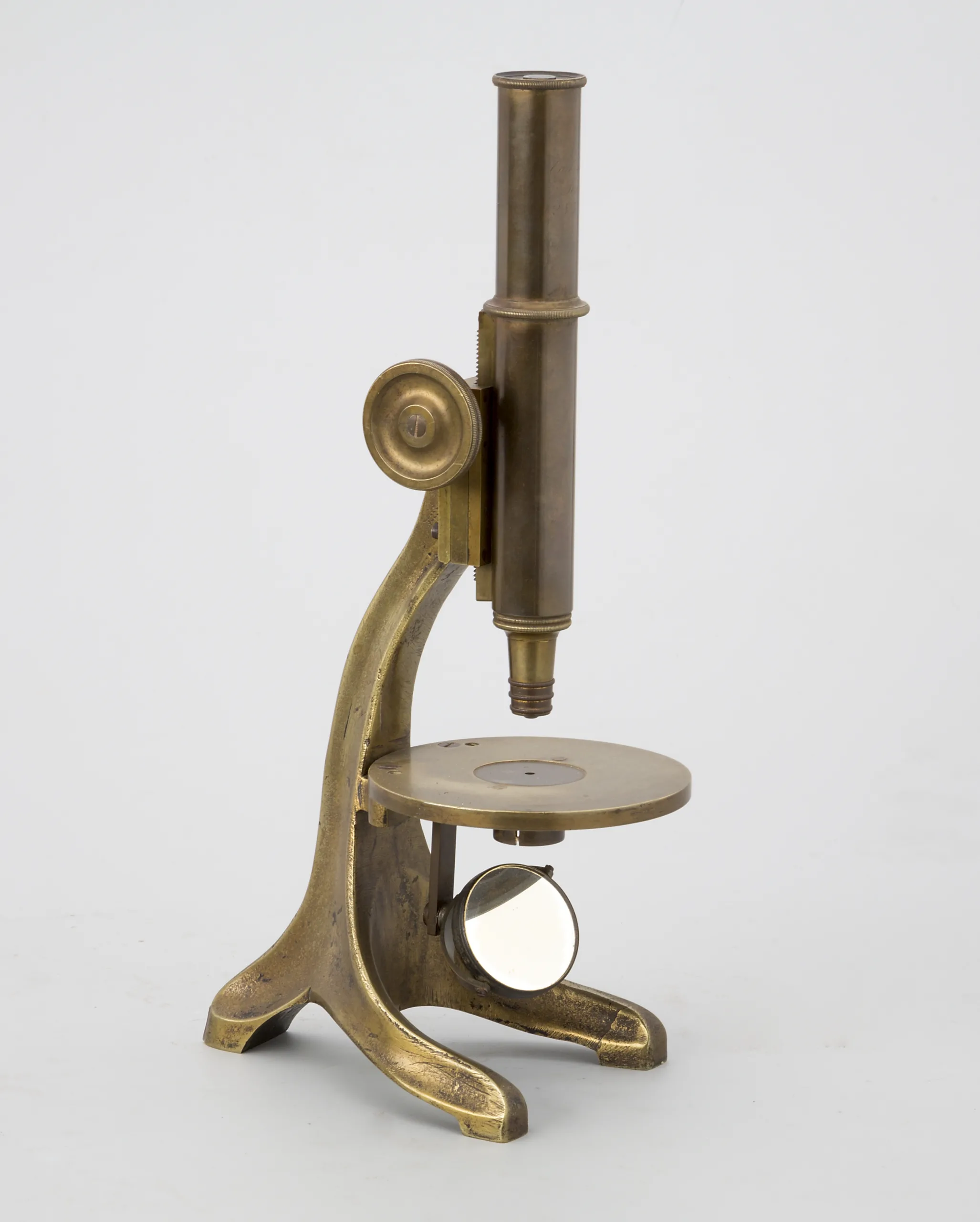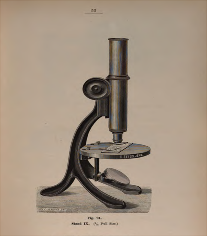Este es un modelo extraordinariamente simple y robusto. El microscopio Zeiss Modelo Stand IX de 1885 tiene una altura de 30 cm. El estativo y la columna de sujeción son una sola pieza de fundición de latón. Tiene un solo sistema de enfoque. Su objetivo está formado por tres lentes que se enroscan sucesivamente. La platina es circular y fija.